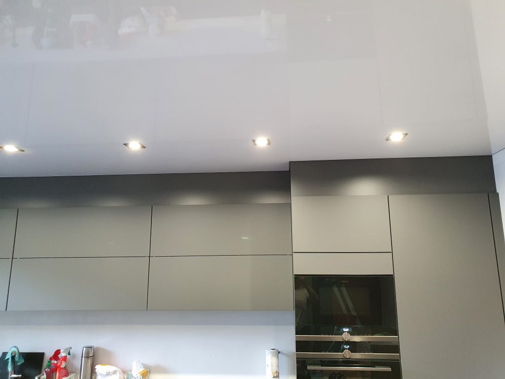 Eine weiße Hochglanzdecke bringt viel Licht und mehr Weite. Die Spiegelung darin verleiht der Küche einen edlen Glanz.