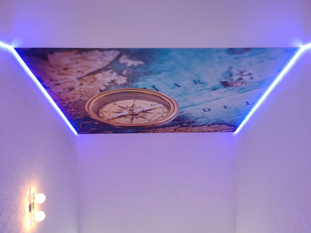 Das Treppenhaus von oben. Die waagrechte Decke wurde in Weiß Matt bezogen, an der Schrägen verziert ein Fotoprint die Decke in ca. sechs Metern Höhe. Links und rechts sind LED Streifen als indirekte Beleuchtung eingebracht, welche in den verschiedensten Farben oder auch Kaltweiß leuchten und über eine Fernbedienung steuer- und dimmbar sind.