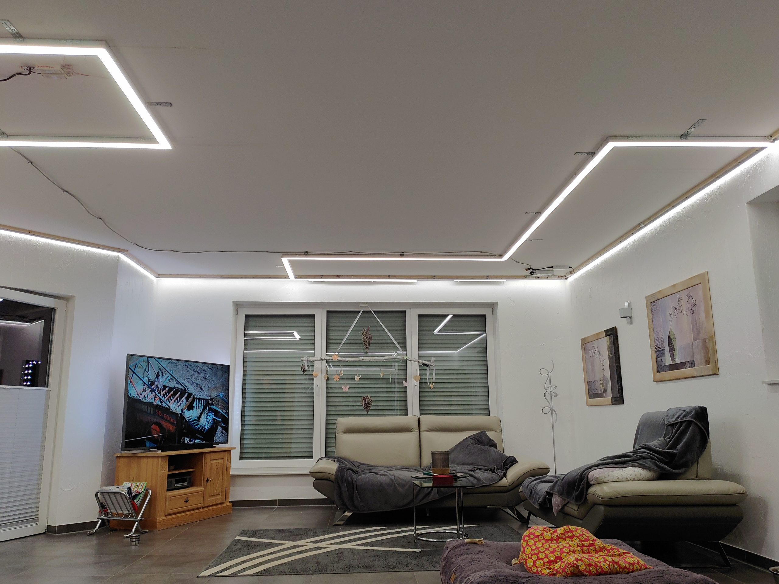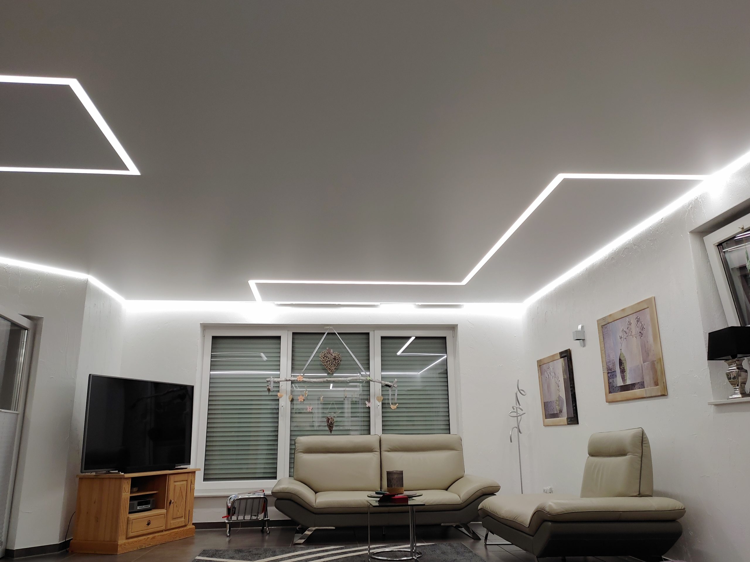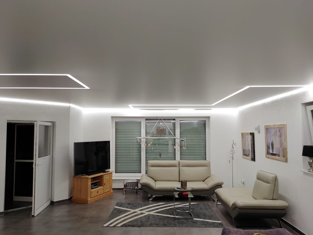 In diesem großzügigen Wohnhaus durften wir die Decken auf insgesamt 110 m² in fünf Räumen, nämlich dem Wohnzimmer, Schlafzimmer, Badezimmer, Flur und der Küche erneuern. Aus ehemals dunklen Räumen sind mithilfe von über 160 Metern LED Streifen wahre lichtdurchflutete Zimmer entstanden. Die Segmente innerhalb der geschlossenen Lampen sind farblich leicht abgesetzt und aus einer Strukturfolie gefertigt.