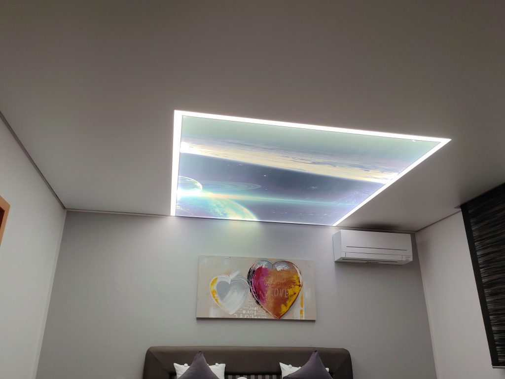Das Schlafzimmer erstrahlt dank der neuen LED Beleuchtung und dem Fotoprint als Lichtdecke über dem Bett in neuem Glanz. Auch hier wurden zur indirekten Beleuchtung LED Streifen entlang der Wände angebracht.